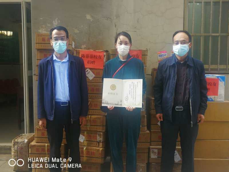 陈菲菲女士在与导师周斌教授联系时听说学校即将开学,遂自行购买了医用酒精、一次性口罩等防疫物资,捐赠给了学校、学院,以实际行动助力学校复学,体现了一名校友对学校学院培养的感恩和回馈,有利于beat365官网beat365官网防疫工作的开展。