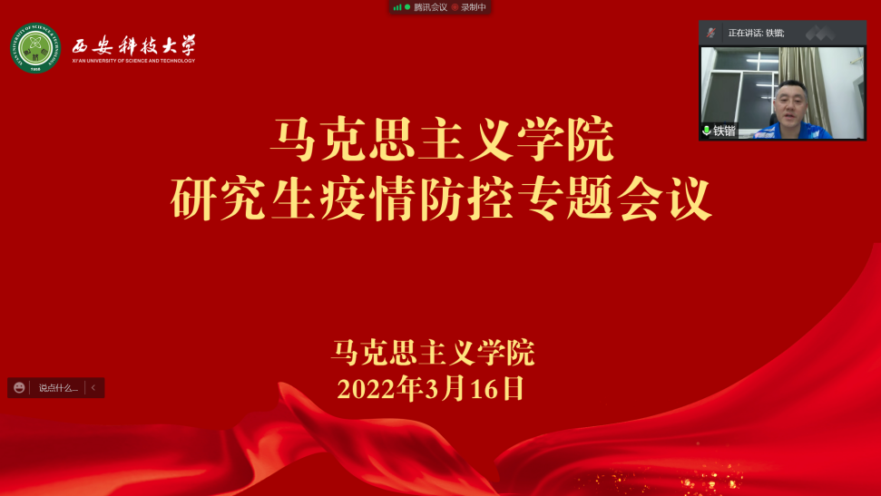 为进一步做好校园新冠肺炎疫情防控,加强雁塔校区研究生疫情防控的思想认识和行动自觉,积极推进研究生教育教学工作,3月16日,beat365平台官方网站以腾讯会议为平台,在线举行了研究生疫情防控期间线上主题班会,马克思主义学院副院长铁锴、研究生辅导员及雁塔校区研究生参加了主题班会。
