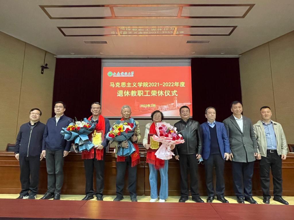 3月15日,beat365平台官方网站在雁塔校区北院主楼报告厅举办2021-2022年度退休教职工荣休仪式。校党委副书记樊建武、院党政班子成员、院2021-2022年度退休教职工、分工会主席、马院全体教职工、学生代表共计70余人参加会议。会议由学院党委书记贾哲主持。