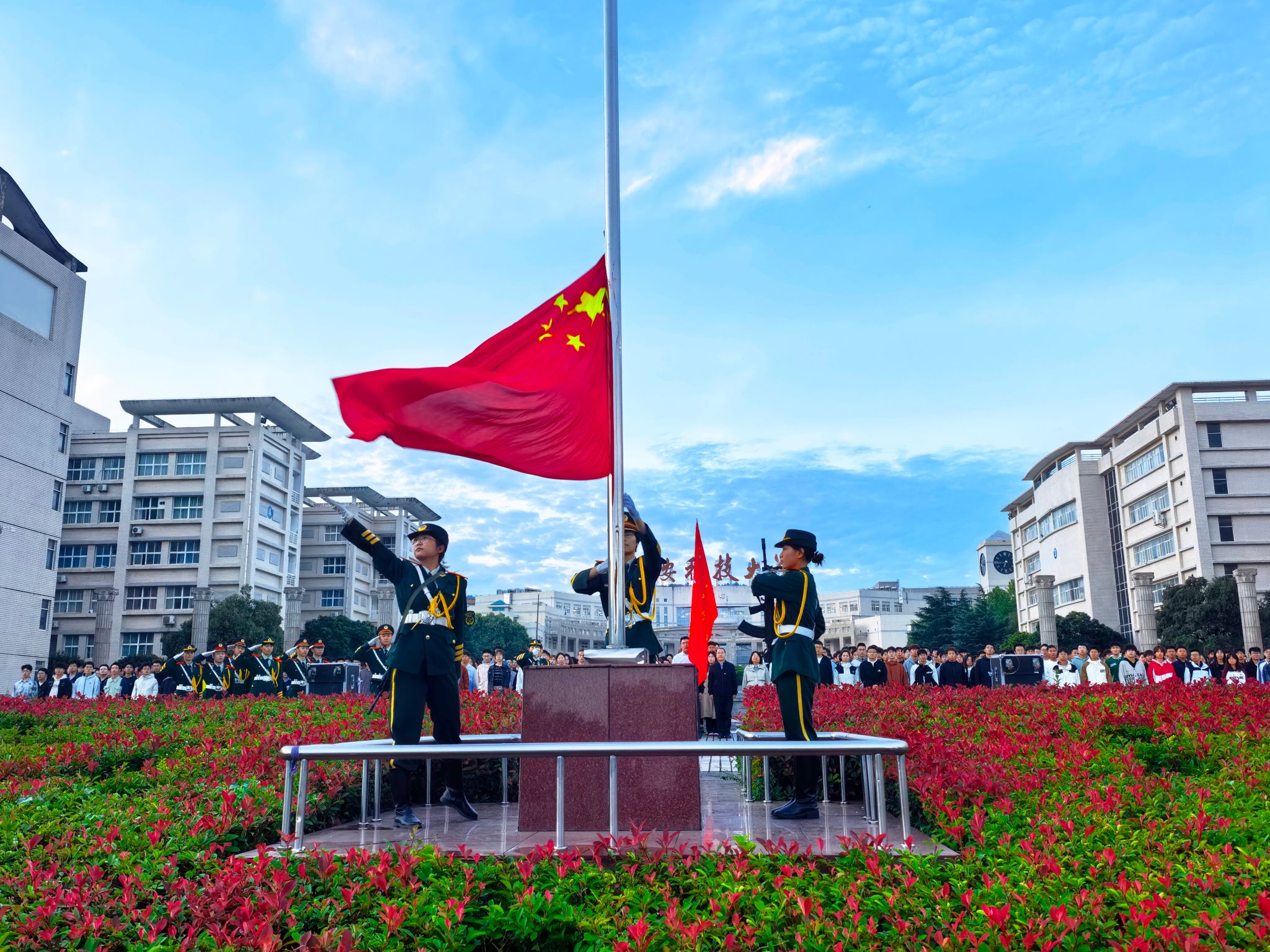 10月13日清晨,临潼校区骊山校园中心广场举行升国旗仪式,beat365平台官方网站红言宣讲团讲师张丹丹作国旗下主题宣讲。
