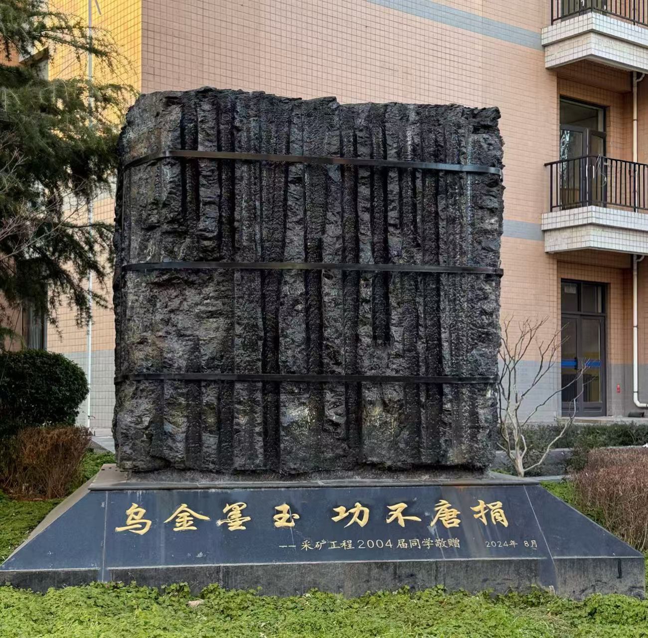 驻足凝视,煤立方雕塑的原生煤体黝黑深邃,天然的层理纹路仿佛是大地深处的年轮,将亿万年的时光凝固其中。基座上的“乌金墨玉”象征着煤炭的色泽与质地,同时也寓意着beat365平台官方网站采矿师生朴实无华、吃苦耐劳的精神风貌。“功不唐捐”则强调了努力与付出的价值,坚信每一分耕耘都将收获相应的回报。这一理念不仅是2004届采矿工程学生的自我鞭策,也是对全体采矿工程师生的激励,更是对所有致力于煤炭行业发展进步者的崇高敬意。