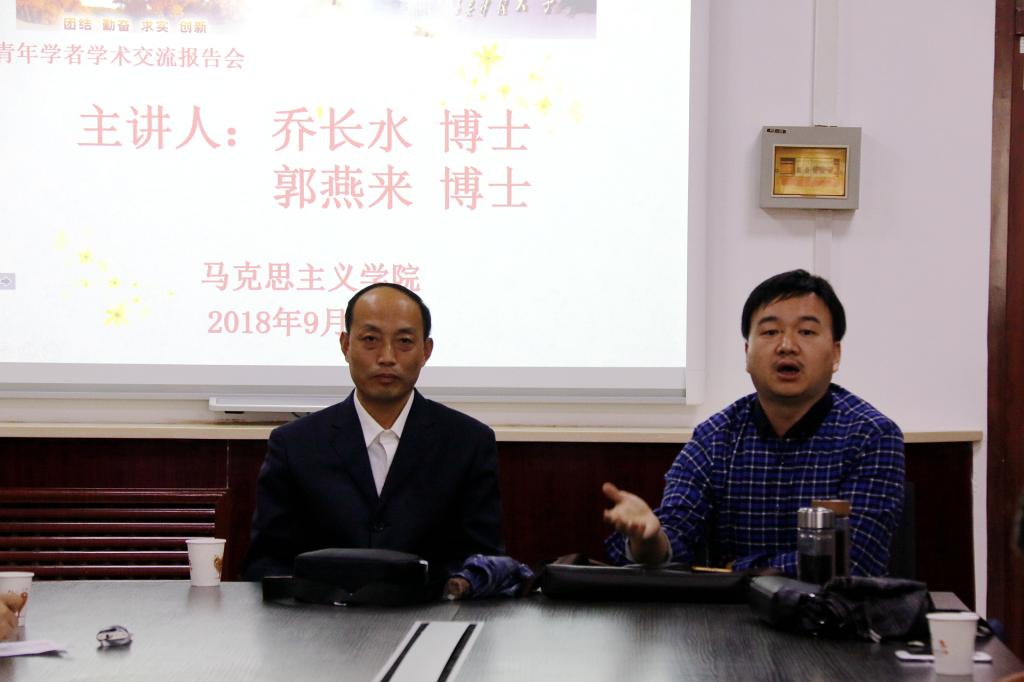 高振岗院长代表学院对二位学者的到来表示热烈欢迎。乔长水博士和郭燕来博士分别就如何研读马克思主义经典著作、构建马克思主义理论学科知识体系和如何树立问题意识、写好学术论文做了学术报告,之后和在座师生进行了深入交流和研讨。