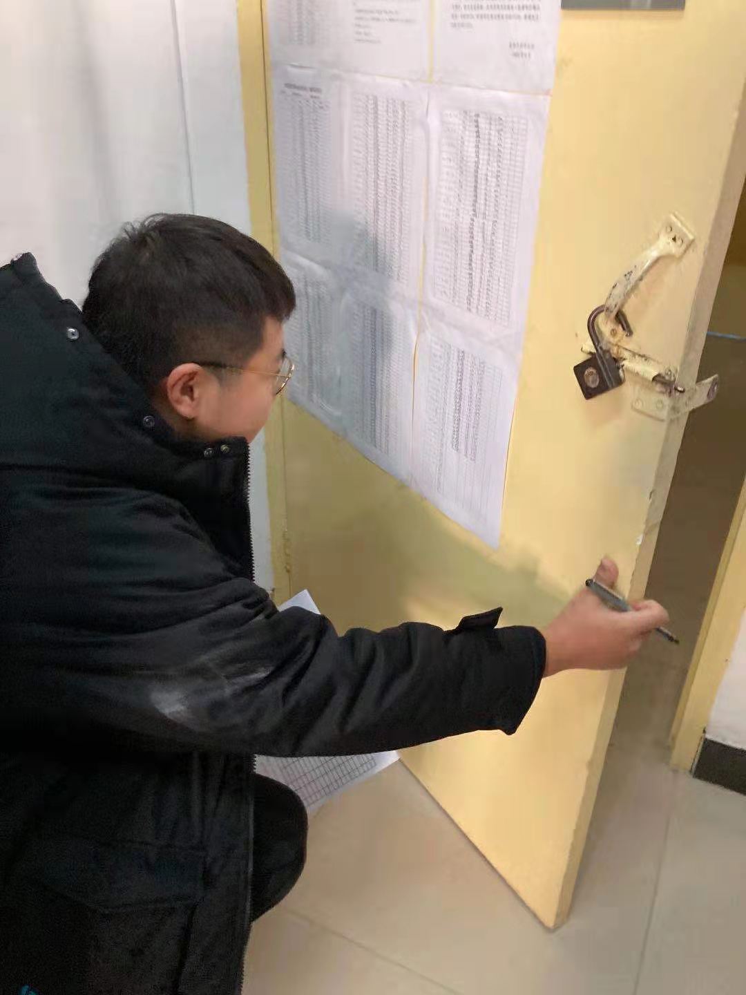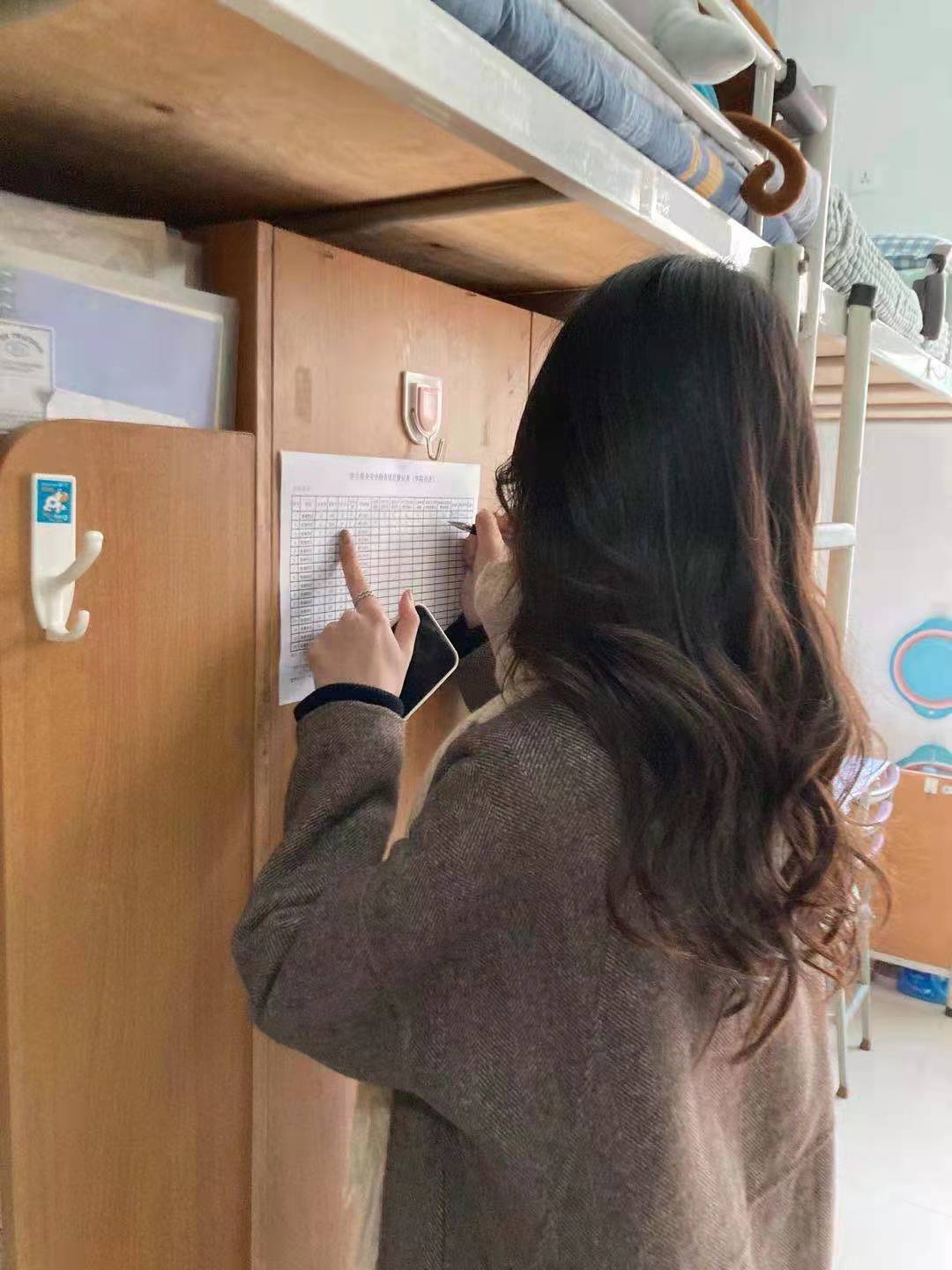 检查前,张杰向检查人员进行了工作说明,强调了注意事项,董可怡向宿舍管理员报备了来检人数。检查时,院生活部学生干部认真检查了每个宿舍疫情防控期间宿舍消毒通风情况表填写情况,学生座位插排放置位置及用电情况,并逐一记录。
