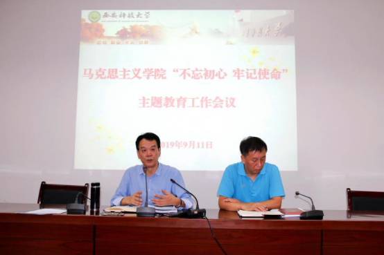 袁金群首先传达了学校“不忘初心、牢记使命”主题教育实施方案,强调不忘初心、牢记使命,是加强党的建设的永恒课题,是全体党员、干部的终身课题。开展这次主题教育,就是要坚持思想建党、理论强党,使所有党员在理论学习上有收获,在思想政治上受洗礼。主题教育要在全体党员中开展,从2019年9月开始,11月底基本结束,集中教育时间不少于3个月。要把学与做结合起来,把查与改贯通起来,处级以上领导人员作为“关键少数”,要先学先改、即知即改,示范带动广大党员、干部的学习教育,处级以上领导干部之外的党员参加主题教育,要以党支部为单位,结合“两学一做”学习教育常态化制度化,依托“三会一课”、主题党日等形式等进行。在组织领导上要落实主体责任,强化督促指导,坚持统筹兼顾,力戒形式主义,营造浓厚氛围。