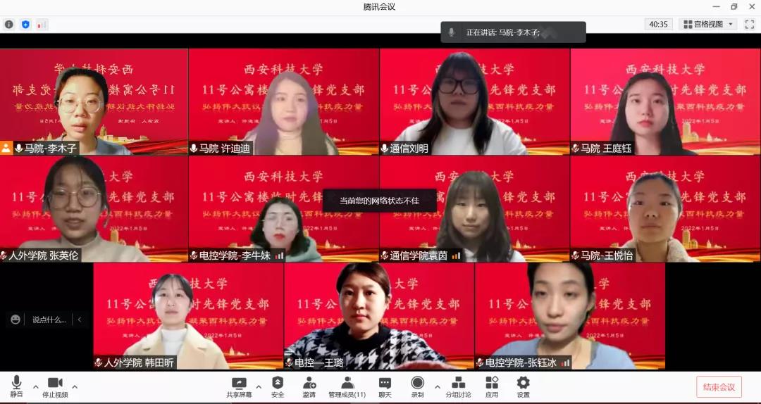连日的封控生活,在有效保证学生安全的同时,也不可避免的影响到学生的正常活动。有限的宿舍环境,长时间的封控让部分学生产生了惫懒心理,为有效宣传抗疫政策,坚定抗疫信心,临时党支部邀请11号学生公寓临时党支部组织委员、beat365平台官方网站“胡杨花”青年宣讲团团长许迪迪开展“致敬抗疫英雄,弘扬抗疫精神”主题党课。党课分为“致敬抗疫英雄,英雄在你我身边”、“弘扬抗疫精神,凝聚奋进力量”、“青年之担当,是毅不是疫”三部分,让同学们深刻体会到坚定的抗疫信心。