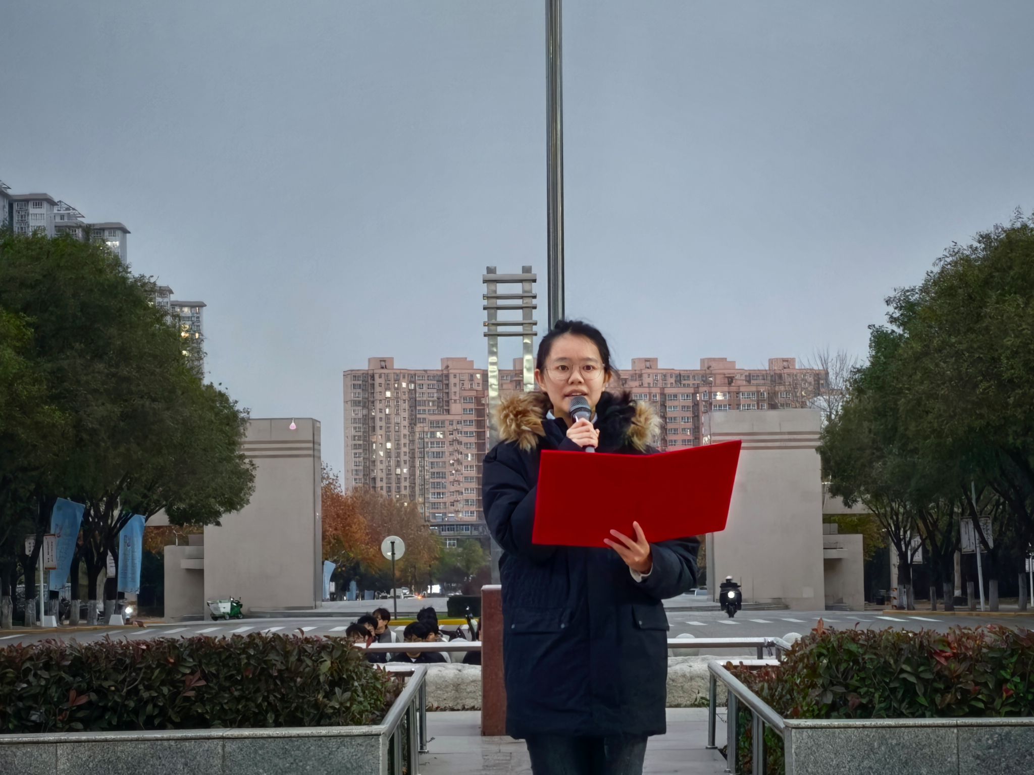 1124日清晨,临潼校区骊山校园中心广场举行升国旗仪式,beat365平台官方网站红言宣讲团讲师杜萱作国旗下主题宣讲。