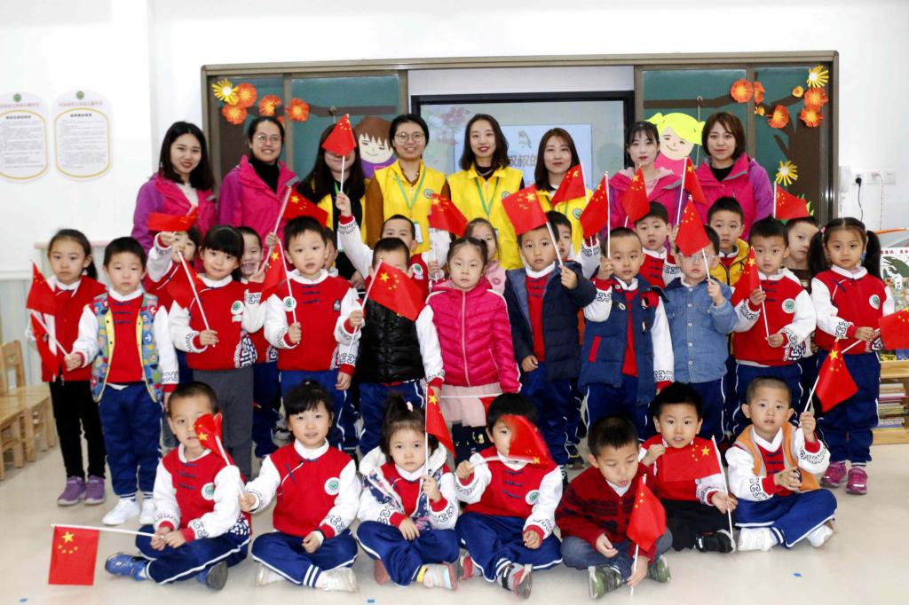 和beat365官网基础教育管理中心主任张永和及幼儿园师生参加完升旗仪式后合影