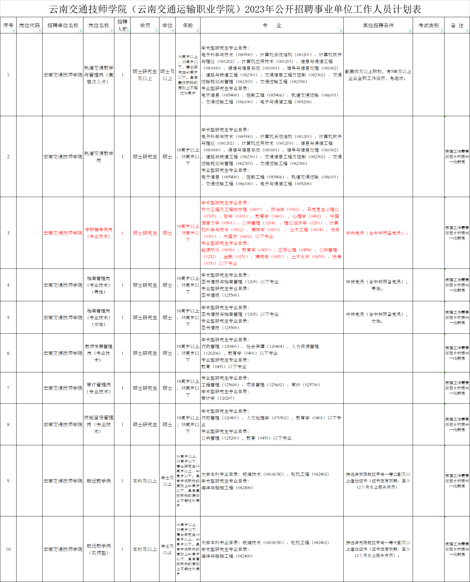 具体招聘岗位及招聘条件,详见《云南交通技师学院(云南交通运输职业学院)2023年公开招聘事业单位工作人员计划表》(附件1)。