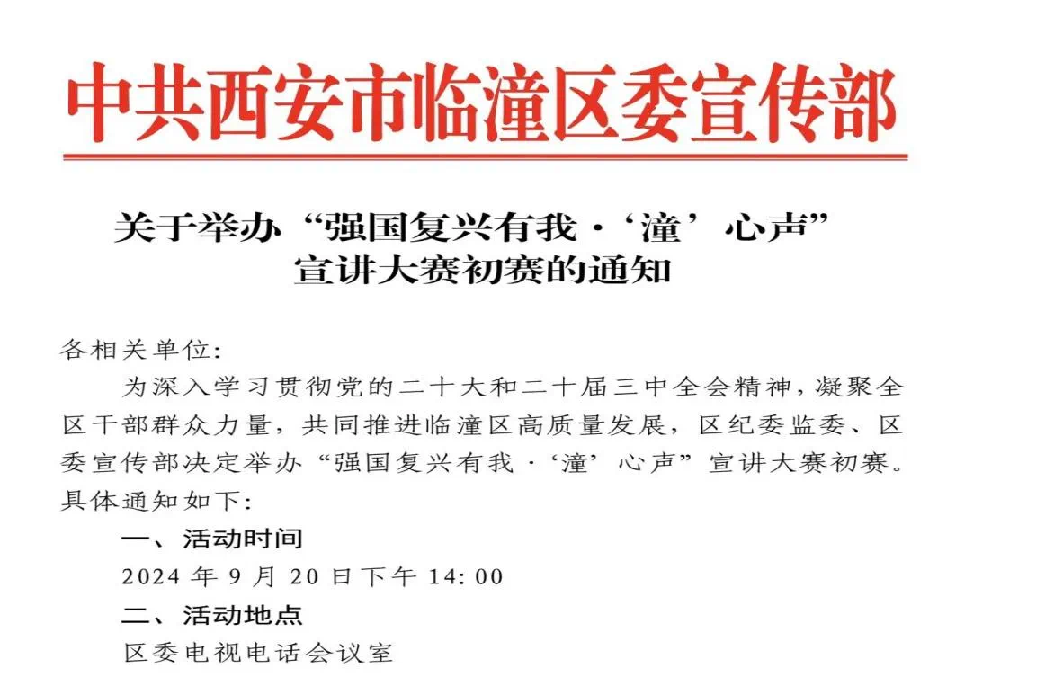 为深入学习贯彻党的二十大和二十届三中全会精神,凝聚临潼区干部群众力量,深入挖掘临潼区的先进人物事迹,共同推进临潼区高质量发展。9月20日下午,中共西安市临潼区委宣传部举办的“强国复兴有我·‘潼’心声”宣讲大赛初赛在区委电视电话会议室隆重举行。