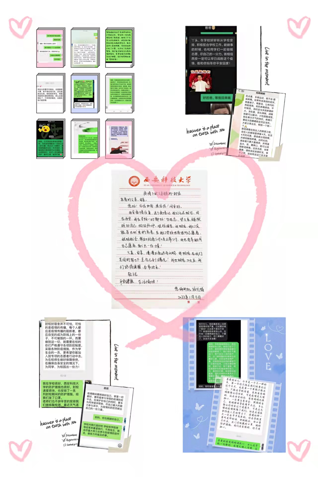 “孩子,学校里所有供应正常,隔离不可怕,可怕的是疫情传播,要在学校注意防控,家里一切都好,不用惦念。”