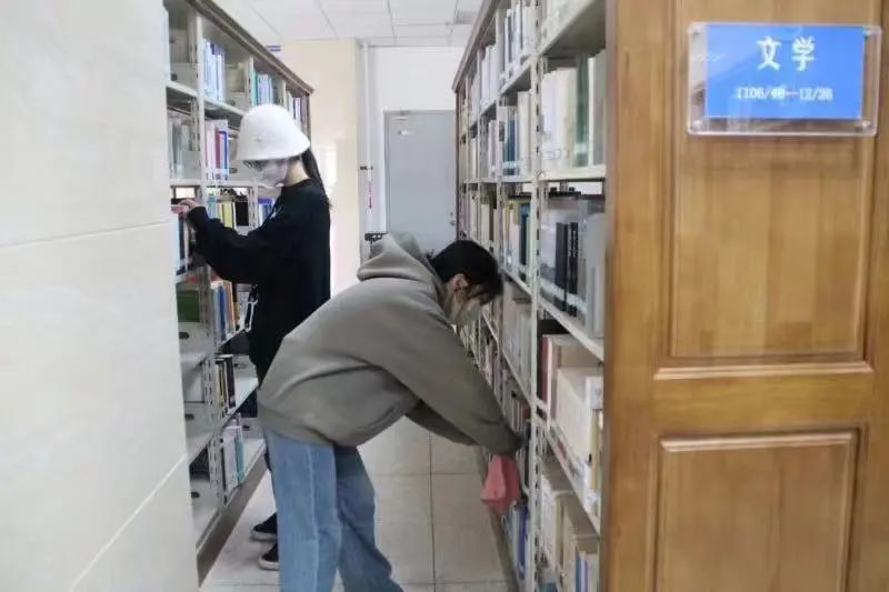志愿者们协助图书馆管理员将近期归还的图书放还书架,并对书架进行了整理和灰尘清扫。在图书馆三层文学图书区和五层马列、哲学图书区,志愿者们细心穿梭,将书本和书架上洒落的灰尘小心翼翼地清除,细心地将每一本书放好。