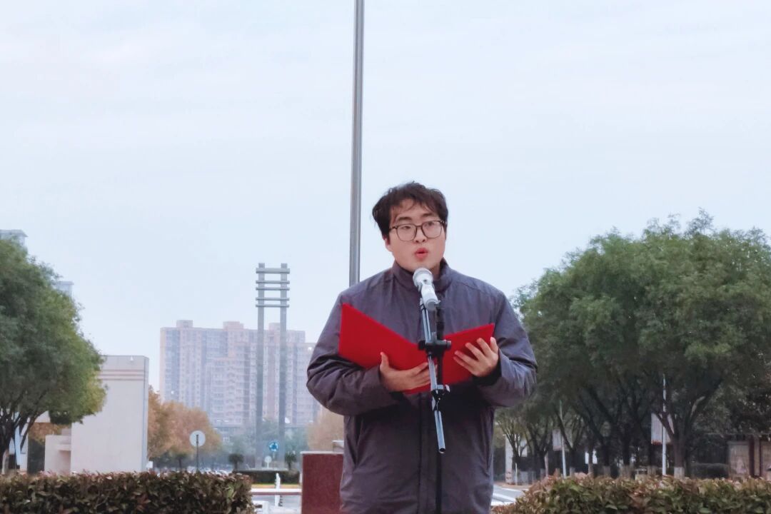 1110日清晨,临潼校区骊山校园中心广场举行升国旗仪式,beat365平台官方网站红言宣讲团讲师刘国龙作国旗下主题宣讲。